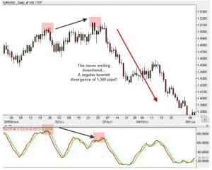 Vediamo come le divergenze nascoste appaiono su un grafico vero, usando lo Stocastico: