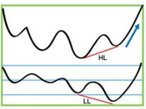 Quando il prezzo si muove da un minimo ad un minimo più basso (LL o “lower low”), e l’indicatore si muove da un massimo fino ad un minimo più alto (HL o “higher low”), vi dovreste preparare ad una divergenza ascendente (bullish):