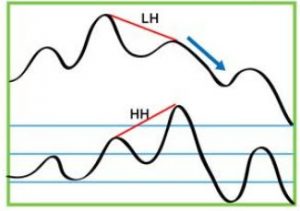 Quando il prezzo si muove da un massimo ad un altro massimo più alto (HH o “higher high”), e l’indicatore si muove da un minimo fino ad un massimo più basso (LH o “lower high”), vi dovreste preparare ad una divergenza discendente (bearish):