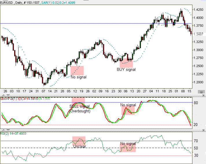 Qui, invece, la situazione è diversa: la combinazione di SAR Parabolico, Stocastico e RSI ci mostra che spesso gli indicatori non sono in correlazione. Questo può causare confusione fra i trader. Nel caso in cui ogni indicatore vi dia dei segnali diversi, è meglio non fare nulla! Aspettate altre occasioni. Se volete aprire una posizione lo stesso, fate come la maggioranza dei trader.
