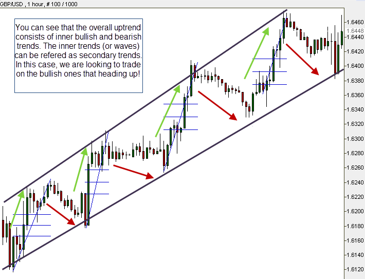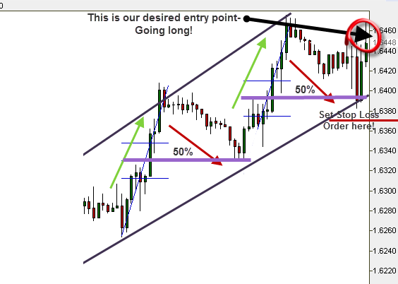 Diamo un occhio di nuovo, ma questa volta con Fibonacci, alle tendenze interne nella seconda parte del trend rialzista generale, o meglio ai trend nel trend, come vengono anche chiamate. Quel nome viene dai grafici su lassi di tempo minori: nel grafico a 4 ore vedrete il trend generale al rialzo, ma spostandovi sui grafici come quello a 15 minuti potrete vedere solo una tendenza interna al ribasso. Verificheremo se si verifica veramente un sano pullback (quando il pullback incontra i criteri di Fibonacci all’interno della tendenza generale):