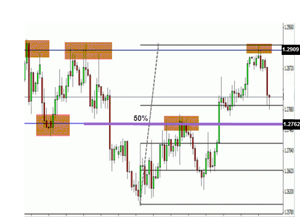 Beh, i nostri sospetti erano fondati! Potete vedere sul grafico che 1.2909 è decisamente un livello di resistenza forte! Osservate quello che succede a 1.2762: si trova esattamente sul rapporto di Fibonacci 0.5!