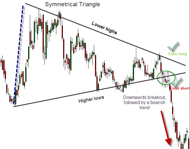 Con un triangolo simmetrico la situazione è un po’ diversa: la rottura potrebbe avvenire su uno qualsiasi dei due lati, per questo attiviamo un’azione OCO (“One Cancel the Other”, in cui l’attivazione di un’azione annulla l’altra). Piazziamo due possibili entrate, una sopra e una sotto il vertice. Dovete poi ricordarvi di annullare quella che si rivela contraria alla nuova direzione del trend: