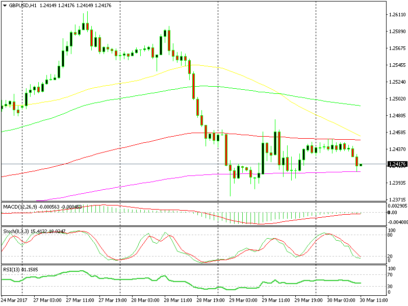 Secondo il grafico forex H4, il vero supporto arriva a circa 20 pips al di sotto di 1.2390 in cui il 100 SMA resta in attesa, tuttavia dobbiamo prendere una decisione. Andare in long ora con un segnale/trading short term, aspettare di scivolare di altri 20 pips, oppure restarne direttamente fuori?