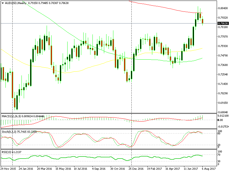 Ora il prezzo è di circa 200 punti più in basso rispetto al top ma c’è ancora un sacco di potenziale per un ribasso. Il primo obiettivo sarebbe la resistenza precedente a 0,7750, che potrebbe ora diventare un supporto.