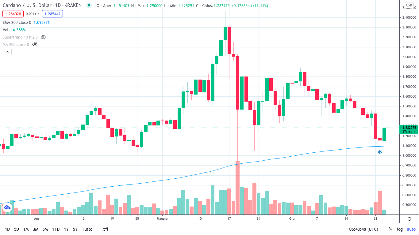 - Il test della media mobile esponenziale a 200 periodi è stato millimetrico per ADA. Il nostro ingresso a 1,10$ è già in forte guadagno: io ho appena chiuso la posizione a 1,28$, ma voi siete liberi di mettere uno stop in pari e tentare di lasciar correre la posizione anche fino a 1,35$.