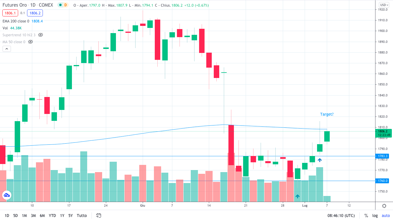 Infine, un aggiornamento anche sulla nostra posizione long sul GOLD. Seguendo quanto dichiarato nella mia analisi forex di venerdì scorso, la posizione aperta a 1762$ è stata chiusa nella giornata di ieri al tocco della media mobile esponenziale a 200 periodi, che in quel momento era a quota a 1808$. Inoltre, sempre secondo quanto dichiarato nella stessa analisi, si è attivato anche il segnale long sulla forza. Siamo entrati, infatti, in chiusura di giornata di venerdì a quota 1783 $. La posizione è attualmente in guadagno di 12$, perciò cerchiamo di gestirla: ho inserito uno stop loss a breakeven per provare un raggiungere un target di 1820$.