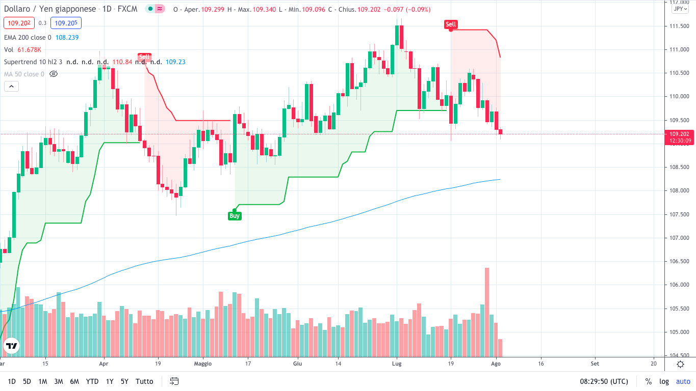 Come si osserva dal grafico giornaliero qui in alto, il cambio ha smesso di disegnare massimi e minimi crescenti. Anche il supertrend è diventato rosso. Per questo, preferisco entrare short sui rimbalzi. Un ingresso ideale sarebbe in area 109,40 con l’obiettivo ambizioso di andare a toccare la media mobile a 200 periodi, posizionata intorno a 108,20.